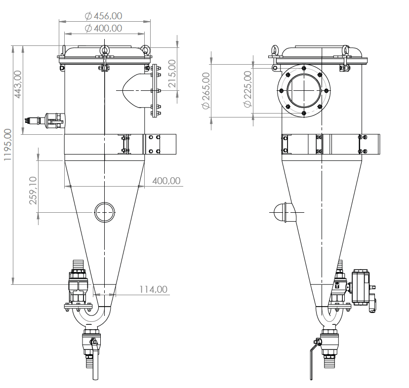 The cyclone secondary shutoffs and moisture trap are designed to be installed in correspondence with the intake line of decompressors used to create vacuum inside tanks. The cyclone secondary shutoff and moisture trap prevents foreign bodies (liquids or solids) that could carry over past the primary shutoff from entering inside the decompressor by blocking the intake line with a stainless steel floating ball. The cyclone consists of a vertical cylinder, which tangentially receives the flow to be scrubbed at high speed. As a result of centrifugal force, the various elements contained inside the fluid are separated according to their density. The purified fluid is freed through the upper axial outlet, whereas the material to be recovered is collected in the lower tapered part of the cyclone and discharged after each job.