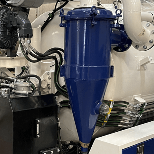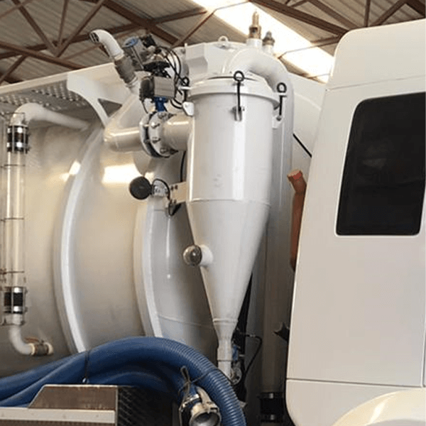 Siklon güvenlik tankı ve nem tutucu, tankların içinde vakum oluşturmak için kullanılan dekompresörlerin giriş hattına uygun olarak monte edilmek üzere tasarlanmıştır. Siklon güvenlik tankı, giriş hattını paslanmaz çelik yüzer bir bilya ile bloke ederek birincil kapatmayı aşabilecek yabancı cisimlerin (sıvılar veya katılar) dekompresörün içine girmesini önler. Siklon, yüksek hızda temizlenecek akışı teğet olarak alan dikey bir silindirden oluşur. Merkezkaç kuvvetinin bir sonucu olarak, sıvının içinde bulunan çeşitli elementler yoğunluklarına göre ayrılır. Arıtılmış sıvı üst eksenel çıkıştan serbest bırakılırken, geri kazanılacak malzeme siklonun alt konik kısmında toplanır ve her işten sonra boşaltılır.